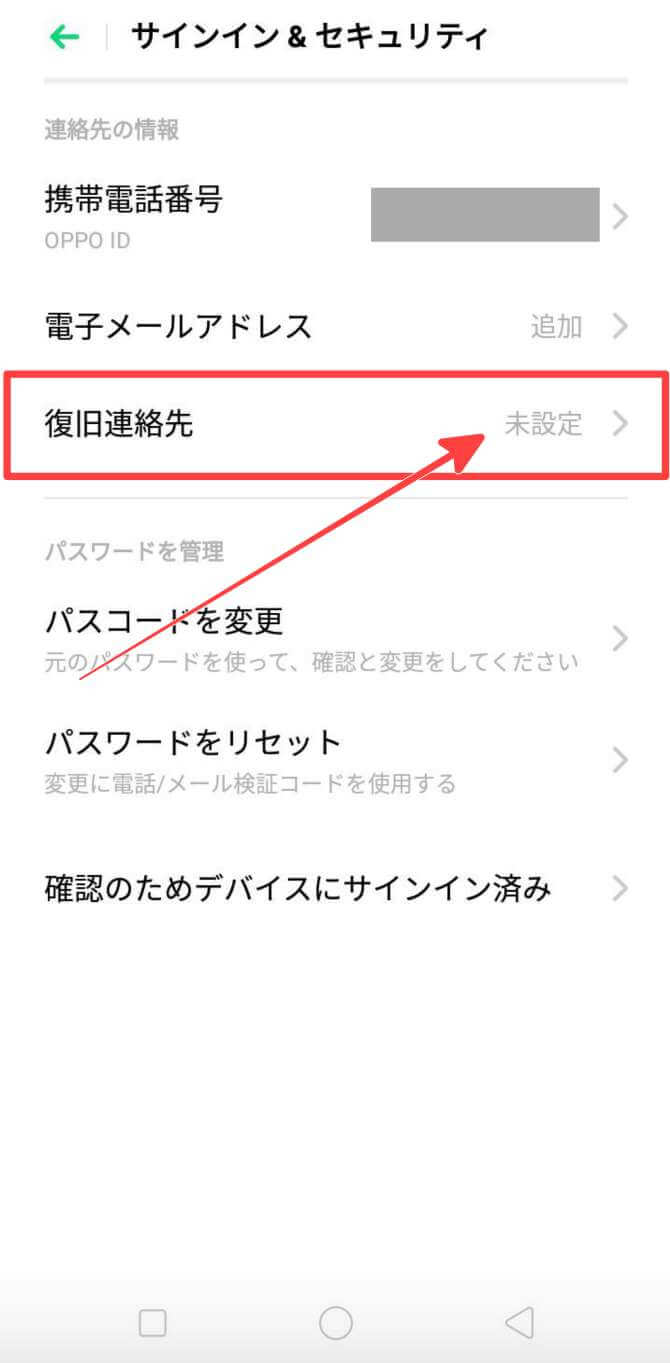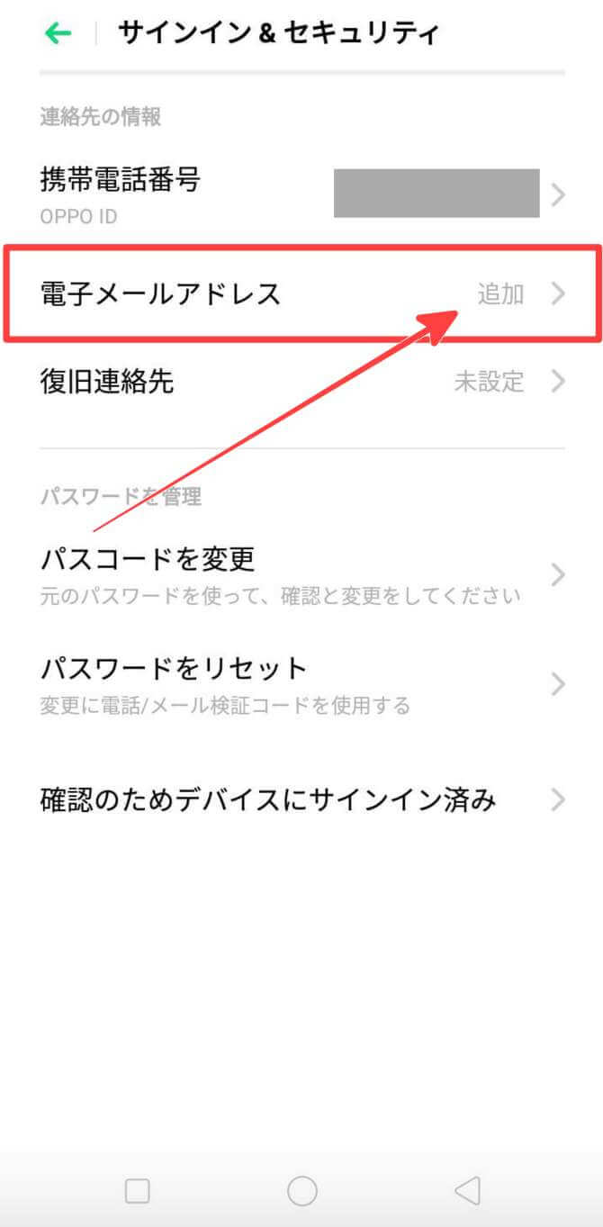 「OPPO ID」の「サインイン&セキュリティ」をタップすると「連絡先の情報」という項目に、