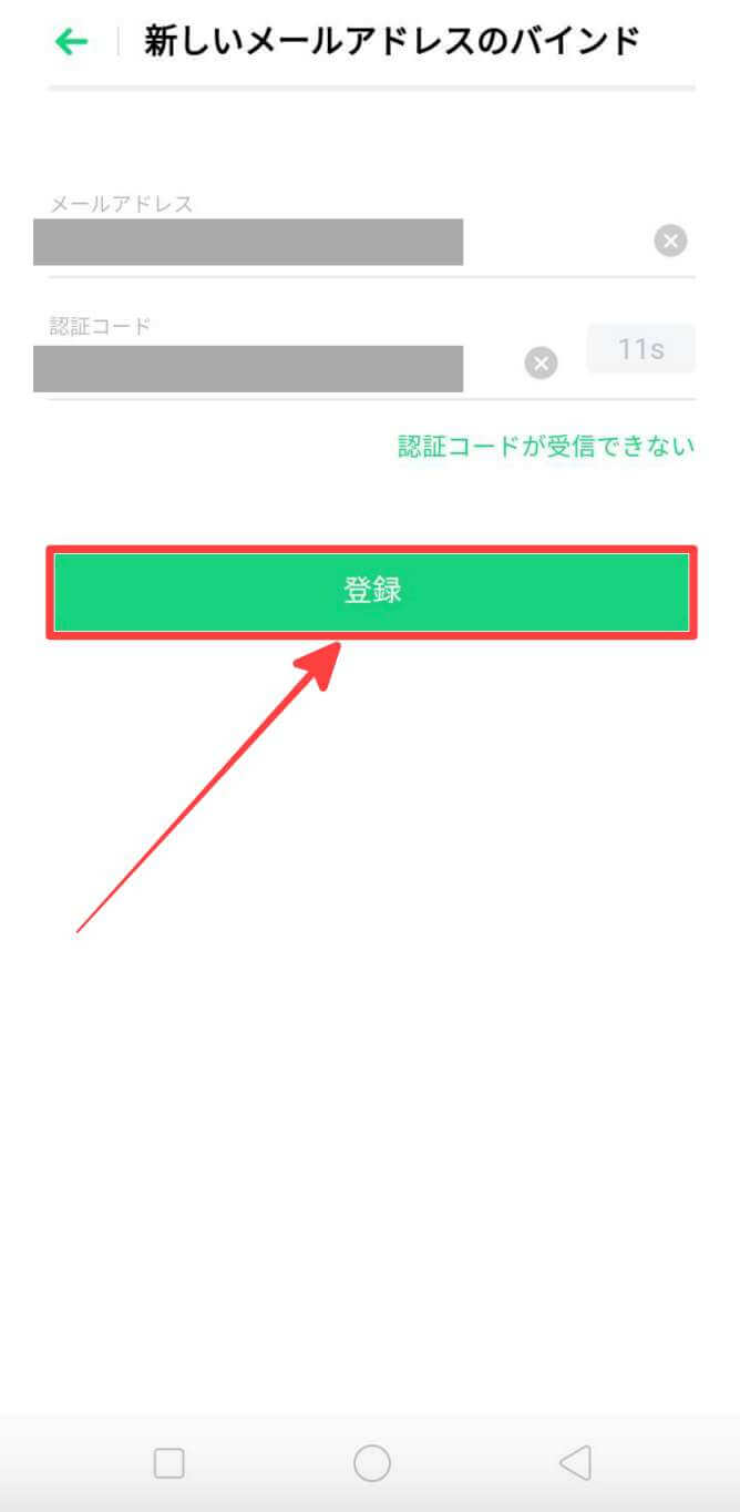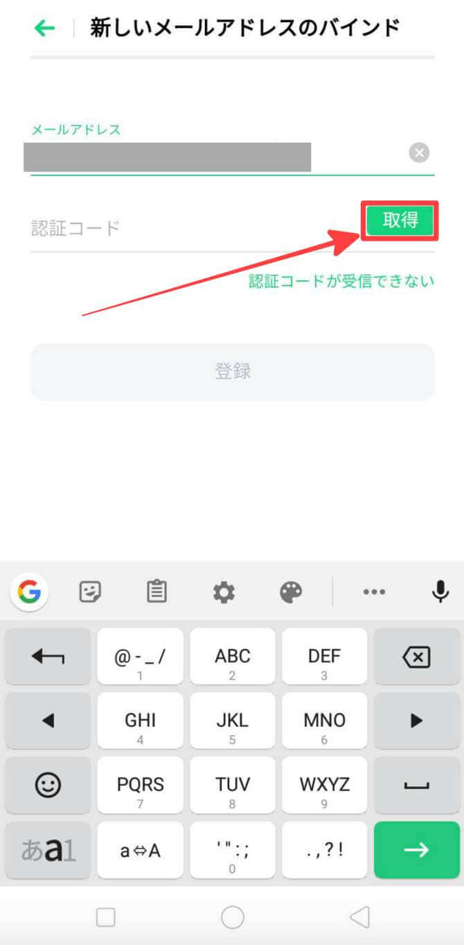 「取得」をタップすると入力したメールアドレスに「認証コード」が送られてきますので、メール内の数字を先ほどの「認証コード」の部分に入力して「登録」をタップします。