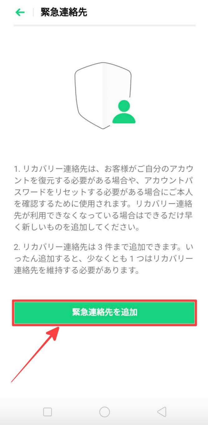 「復旧連絡先」をタップすると確認画面が表示されますので、内容を確認したら一番下の「復旧連絡先を追加」をタップします。