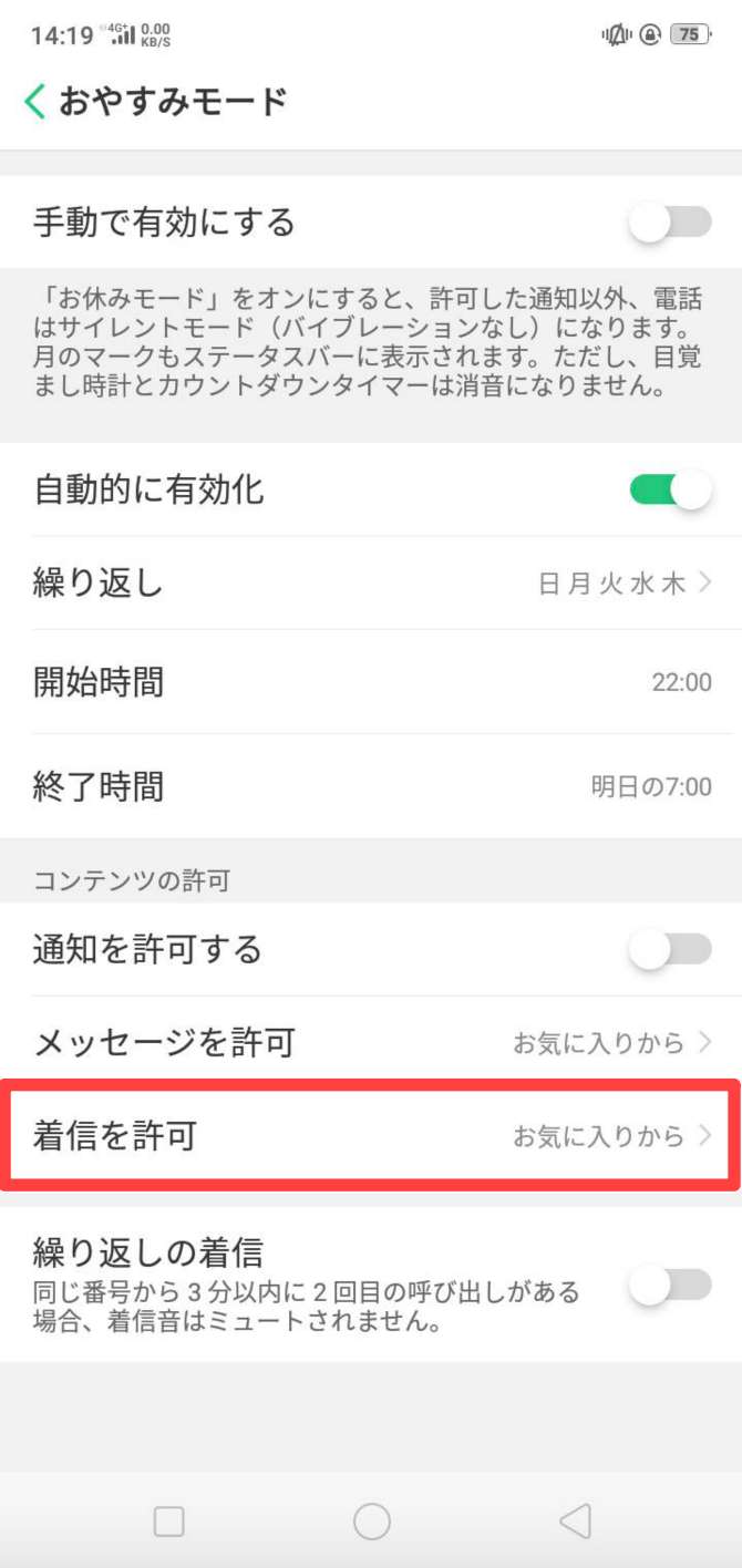 時間と曜日の設定が完了しましたら、次に「おやすみモード」有効中の許可設定に入ります。