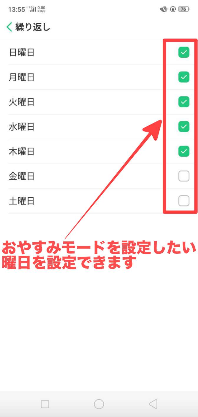 まず、「繰り返し」をタップして、「おやすみモード」を利用したい曜日を設定します。