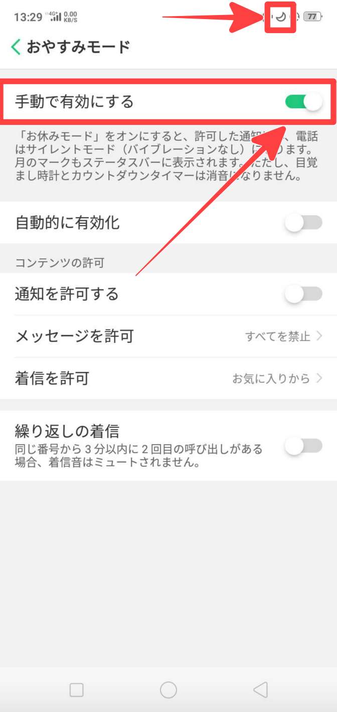 【OPPO】スマホでは「おやすみモード」設定すると、LINEやSNS、電話やメールなどの通知音やバイブレーションを一時的に停止させる事ができます。