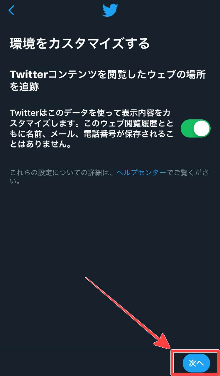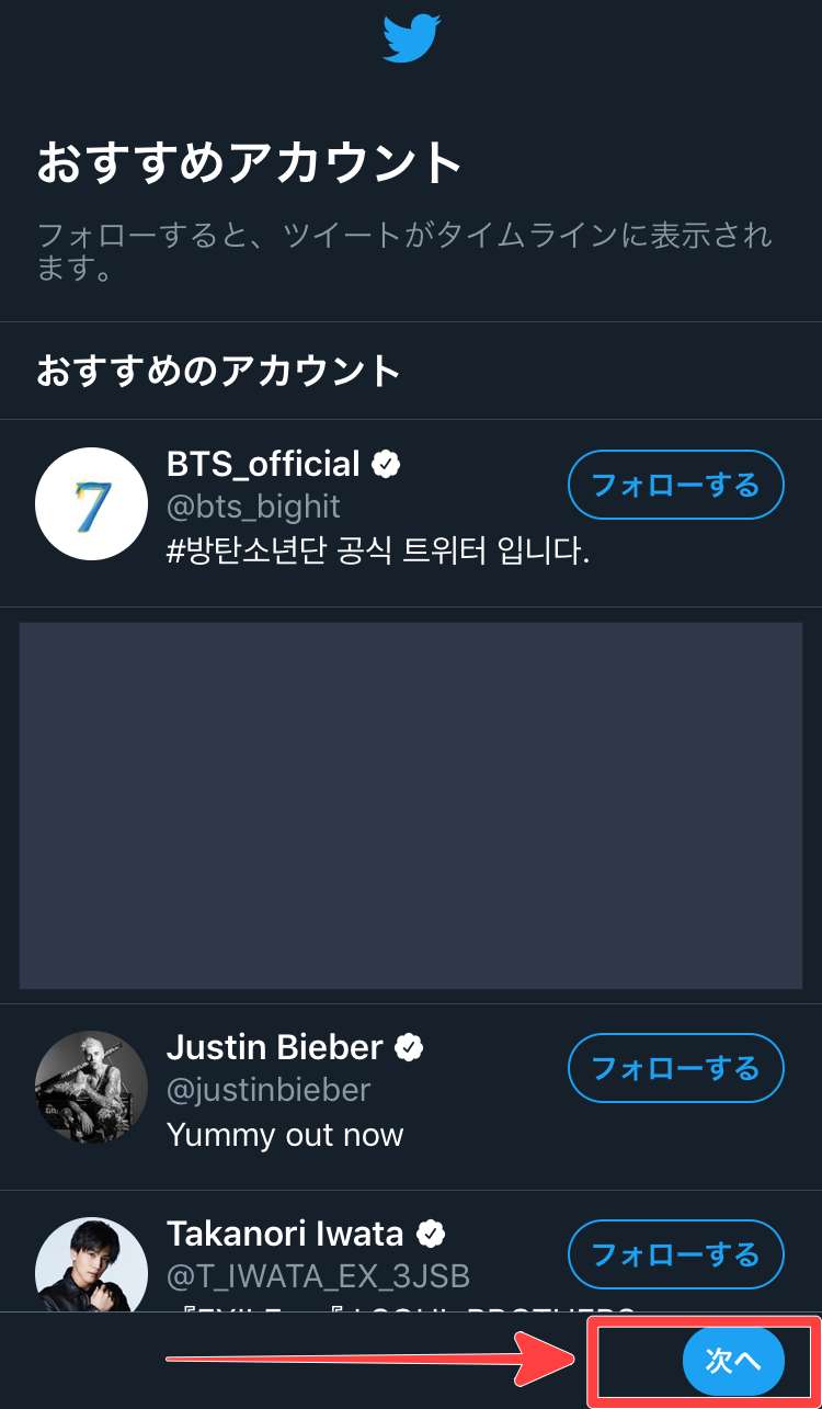 ここはフォローしなくても次に進める事ができますので、フォローしない場合はそのまま「次へ」をタップする事で先に進みます。