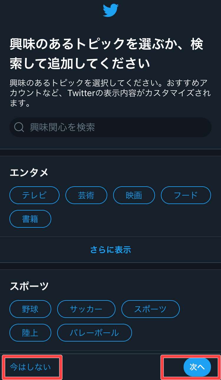 すると次に「興味のあるトピック」や「おすすめのアカウント」をフォローする事ができます。