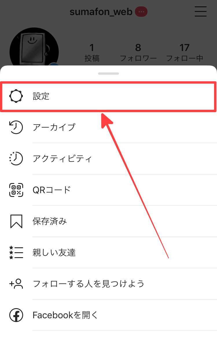 まず初めにインスタグラムの自分のプロフィール画面から右上の「三」をタップした後に「設定」をタップします。