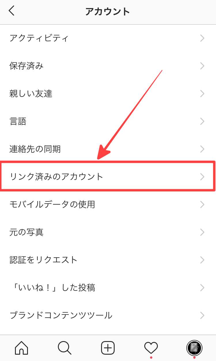 次に「アカウント」の設定画面に変わるので、その中の「リンク済みのアカウント」をタップします。