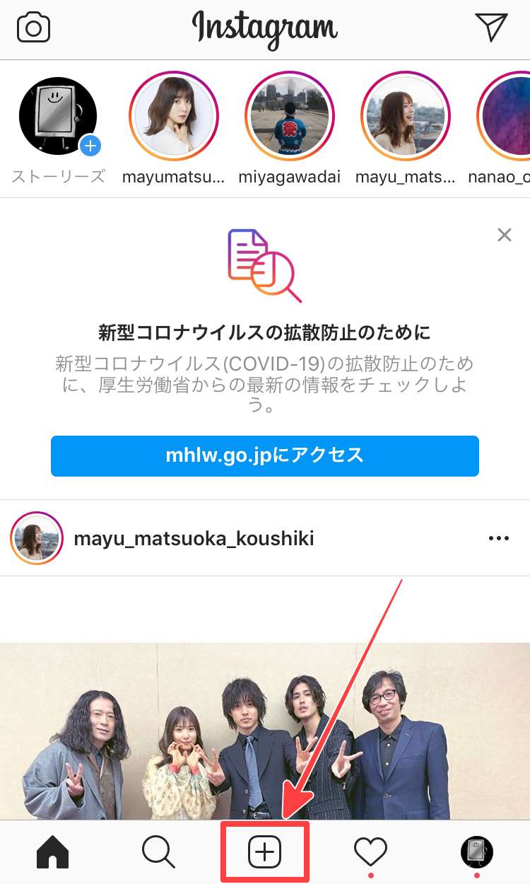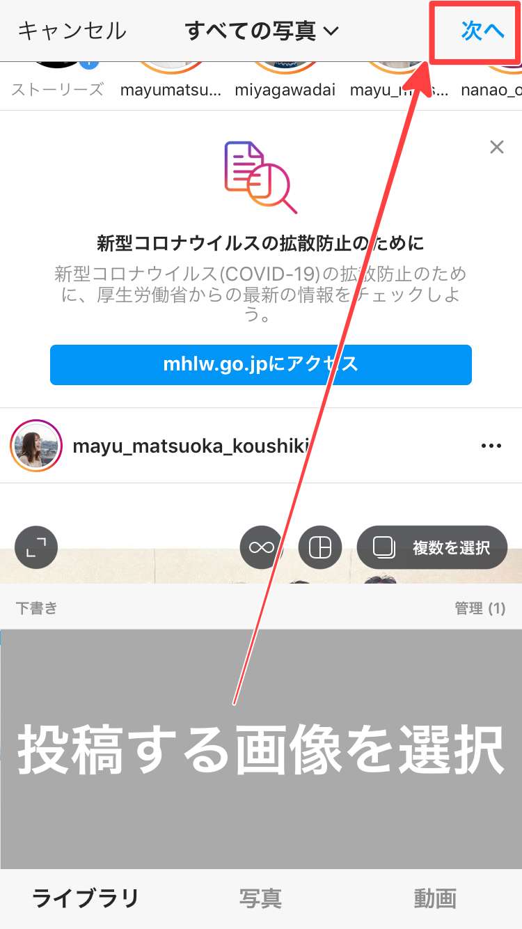 インスタグラムを開いて、タイムライン下にある「+」をタップし投稿したい画像を選択するか、新たに写真・動画を撮影してから右上にある「次へ」をタップします。