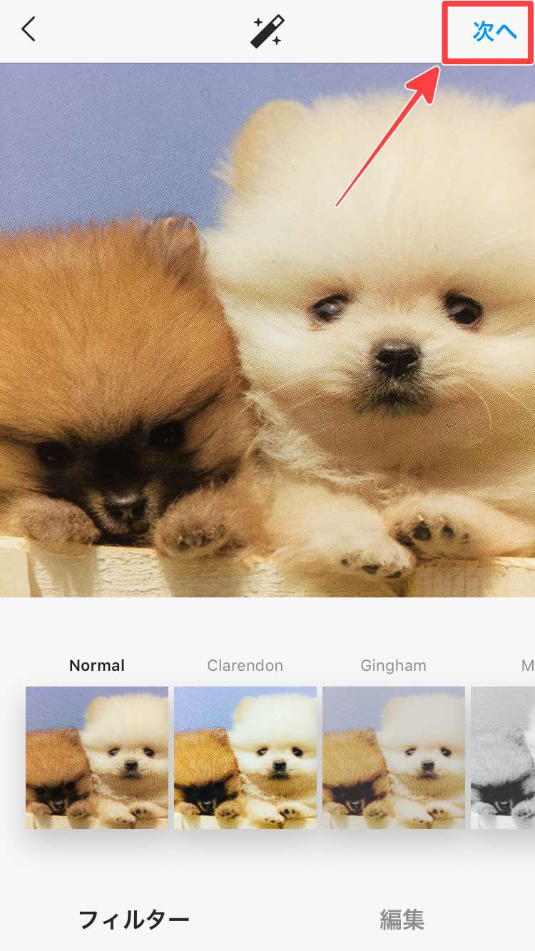 次にフィルターや編集をする事ができますので、お好みで画像等を編集して右上の「次へ」をタップします。