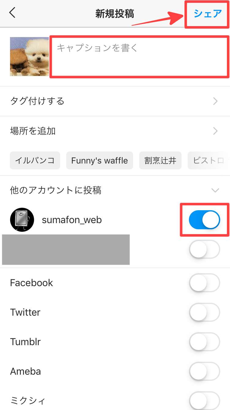 すると「新規投稿」の画面に変わりますので、「キャプション」「タグ付け」「場所の追加」を選択・入力して投稿させたいTwitterアカウントにチェックを入れて最後に「シェア」をタップしたら投稿完了です。
