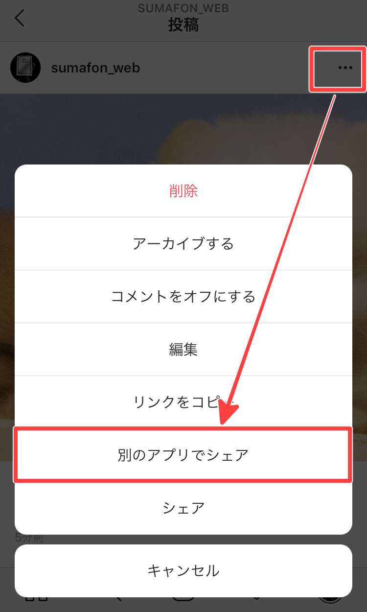 まず、インスタグラムで投稿した写真や動画の右上に表示されている「…」をタップし、「別のアプリでシェア」と言う項目をタップします。