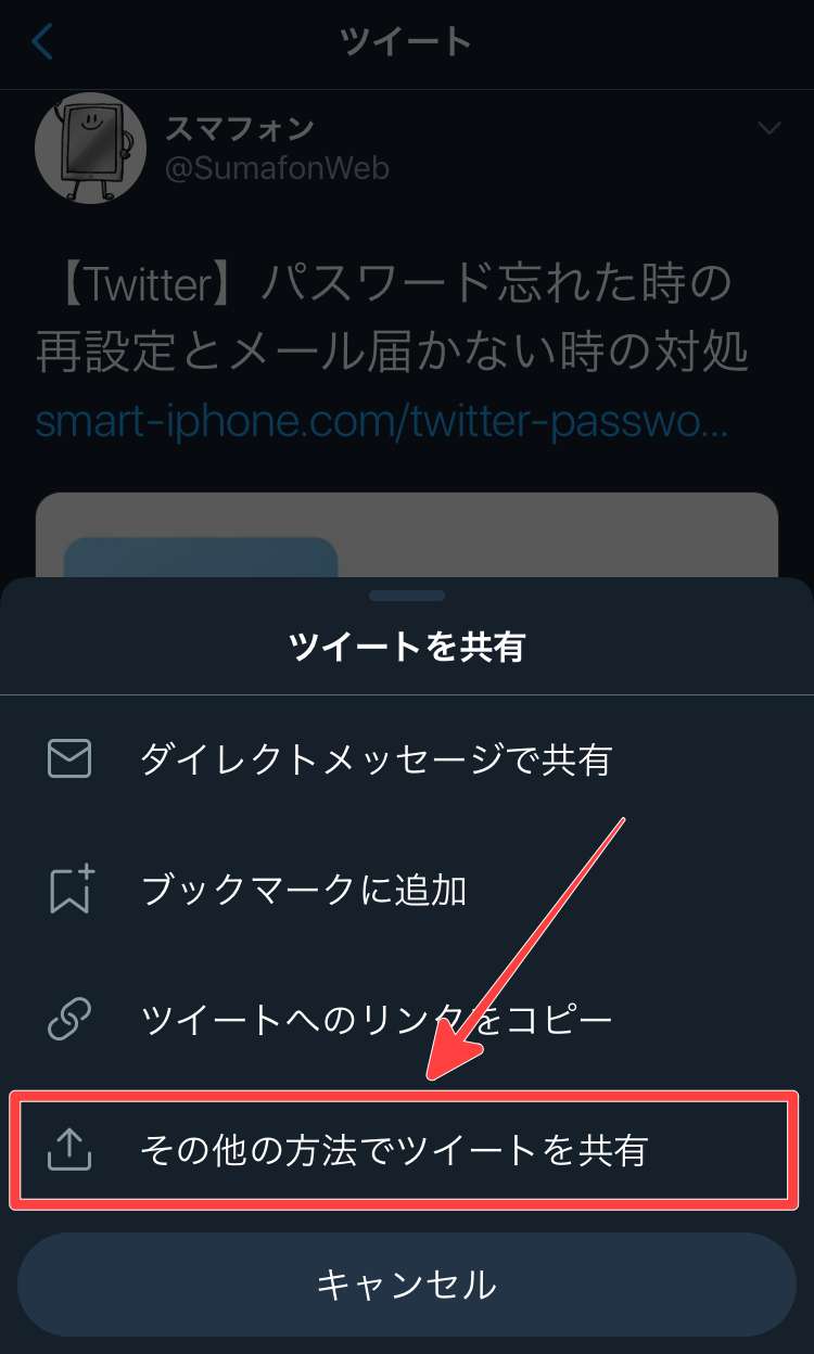 相手のツート画面の右下の「↑」をタップすると「ツイートを共有」というオプション画面が開きますので、LINEで共有したい場合は、「その他の方法でツイートを共有」をタップします。