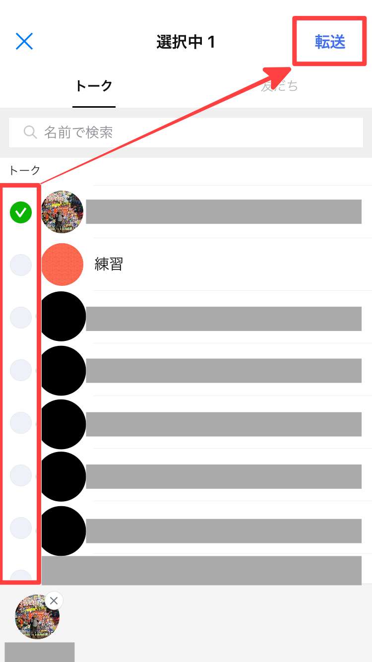 「LINE」アイコンをタップすると送信先を選択できるので、共有したい相手を選びます。
