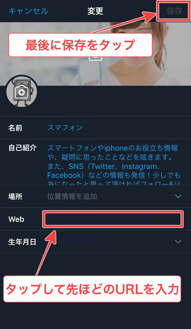 以下の様に「変更」をタップするとプロフィール変更画面が表示されますので、その中の「Web」と書かれてあるところにInstagramのURLを入力し、最後に「保存」をタップします。