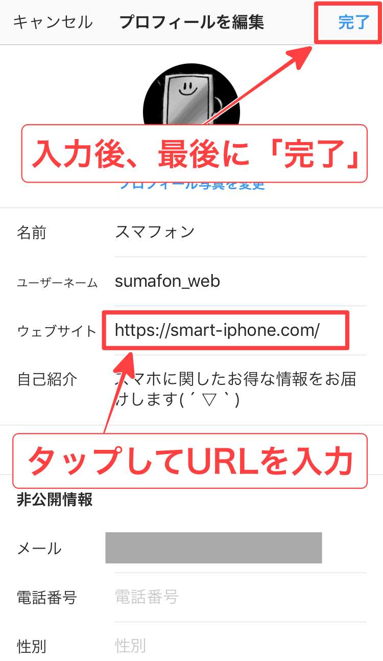 以下の様に「プロフィールを編集」をタップするとプロフィール変更画面が表示されますので、その中の「ウェブサイト」と書かれてあるところに先ほどのTwitterURLを入力し、最後に「完了」をタップします。