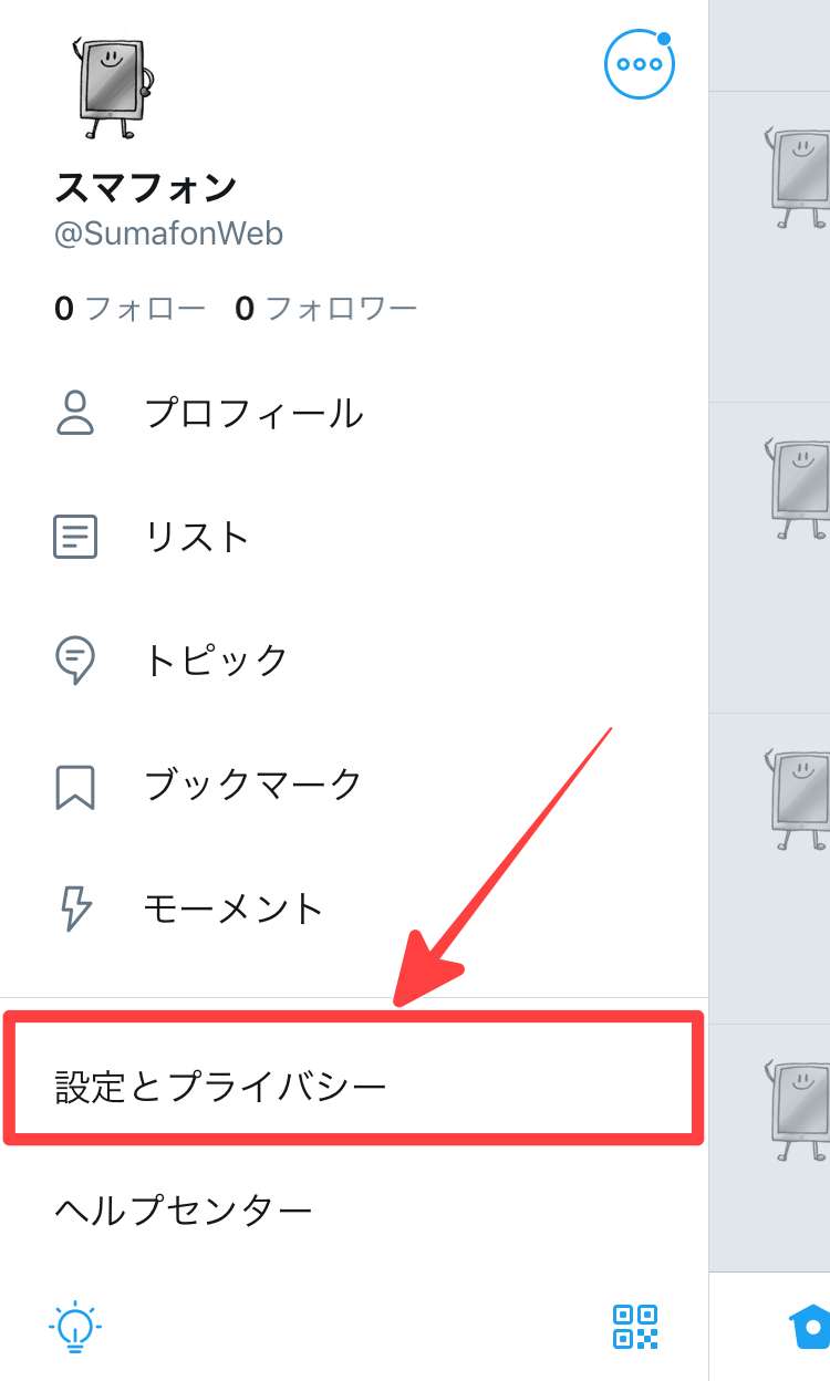すると左上に自分のアイコンが表示されているはずなので、アイコンをタップすると設定メニューが表示されます。