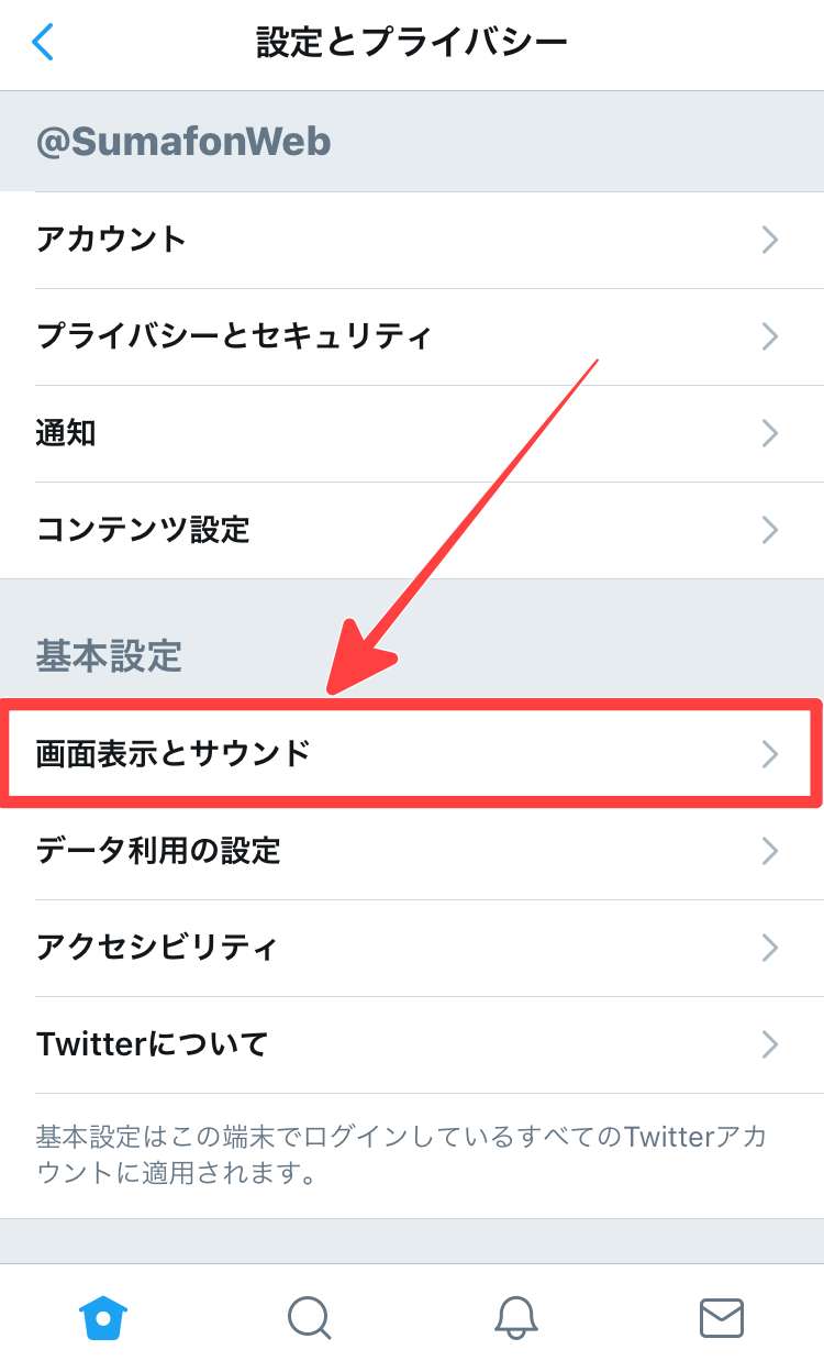 次に「設定とプライバシー」をタップした後、基本設定内の「画面表示とサウンド」をタップします。