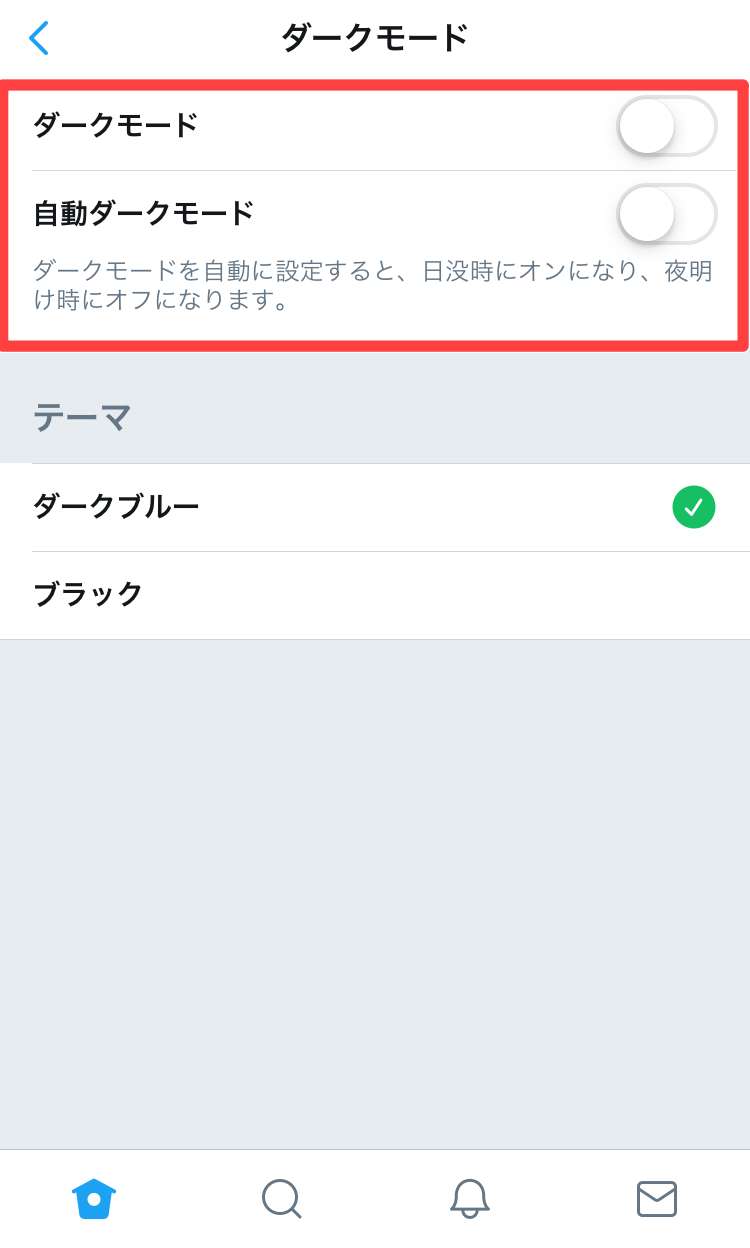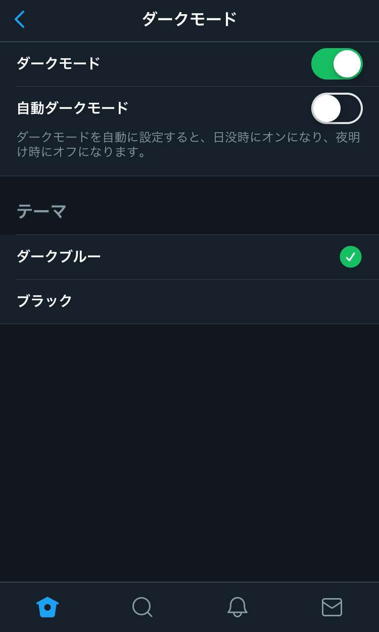 そうなんです。実は現在(2020年時点)Twitterアプリではテーマカラーを変更は、ブラウザ版と違って選択できるテーマカラーが2色しかありません。そして「テーマ」の項目にある「ダークブルー」と「ブラック」も「ダークモード」を選択した時のみしか反映されません。