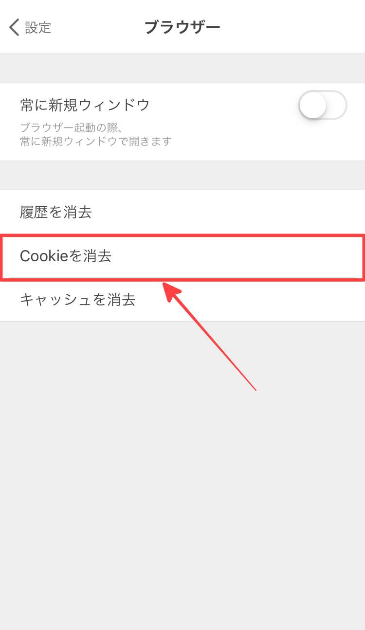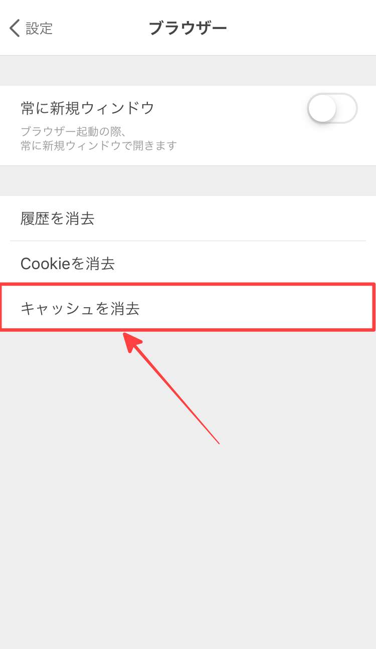 次にブラウザー」をタップすると「キャッシュを消去」と言う項目があるので、こちらをタップします。