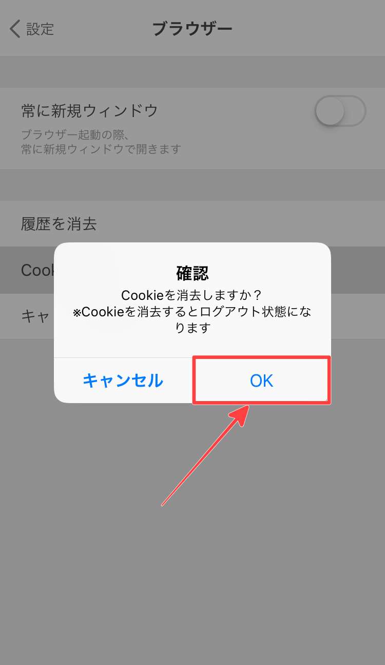 「確認」表示されて問題がない場合は「OK」をタップすることでYahooアプリ内に保存されているクッキーが削除されます。